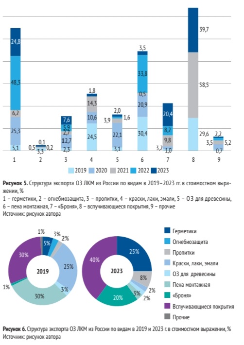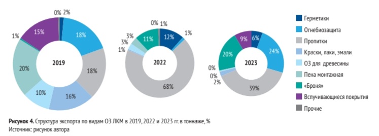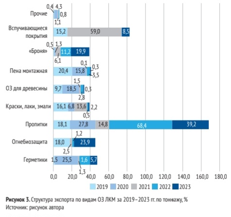 Среднегодовые темпы экспорта из России различных видов ОЗ ЛКМ в 2019–2023 гг. период носили скачкообразный характер. Так, рост экспорта герметиков отмечался в 2020 и 2022 гг., огнебиозащитных средств – в 2023 г., красок – в 2021 и 2023 гг., вспучивающихся покрытий – в 2023 г., а пены монтажной – в 2022 г.