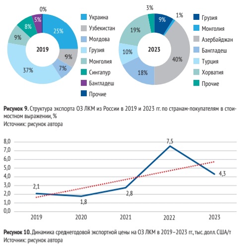 Анализ среднегодовых экспортных цен на ОЭ ЛКМ в 2019–2023 гг. по странам-покупателям показал, что на протяжении всего периода самые высокие цены были на ОЗ ЛКМ были при поставках в Узбекистан, Украину, Монголию и Бангладеш. При этом в целом средние экспортные цены на тонну ОЗ ЛКМ незначительно выросли для Монголии и Абхазии (табл. 9).